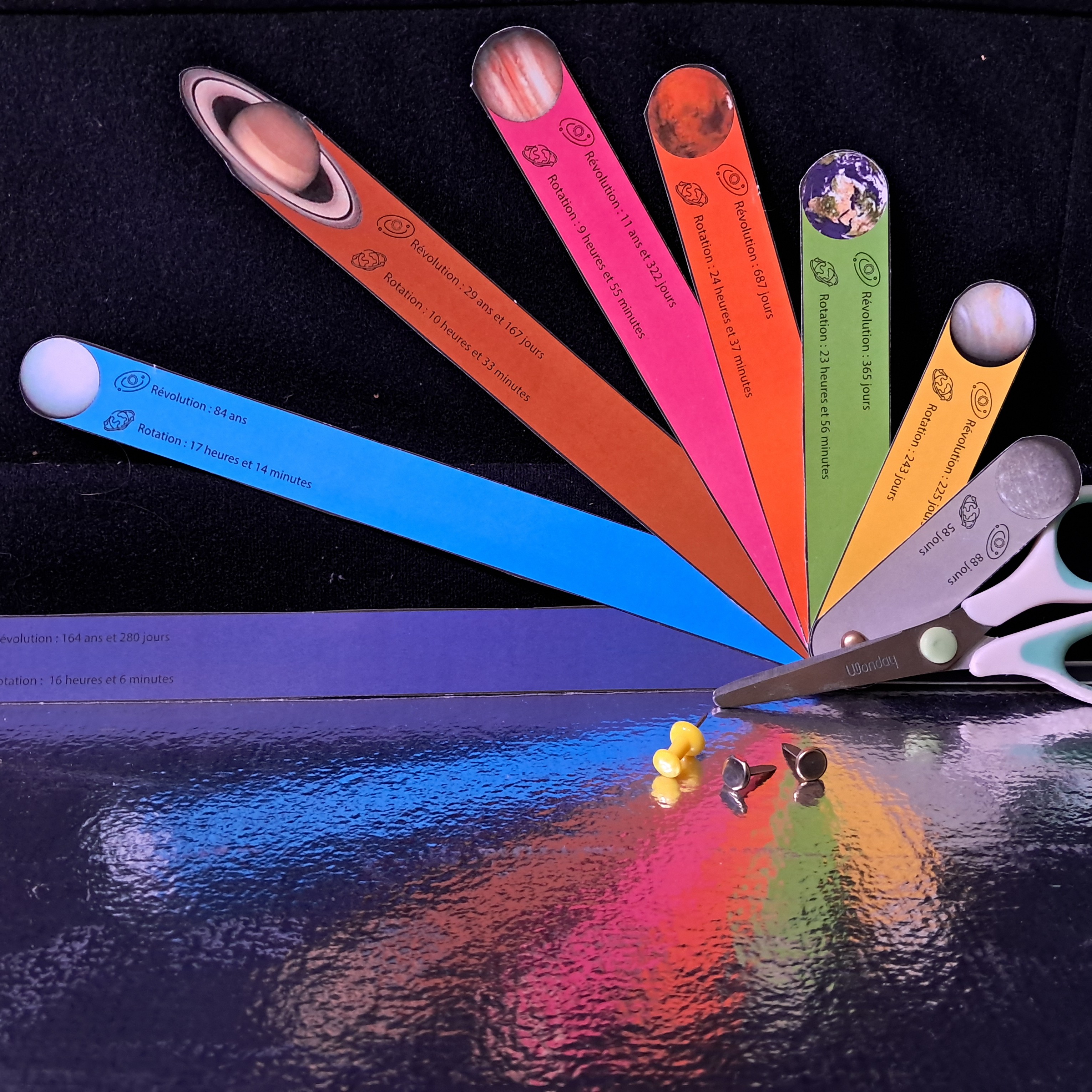 Viens découvrir les astres du système solaire en réalisant une maquette des 8 planètes en orbite autour du Soleil. Compare ensuite l'éloignement de ces astres ainsi que leurs vitesses de rotations et de révolutions.