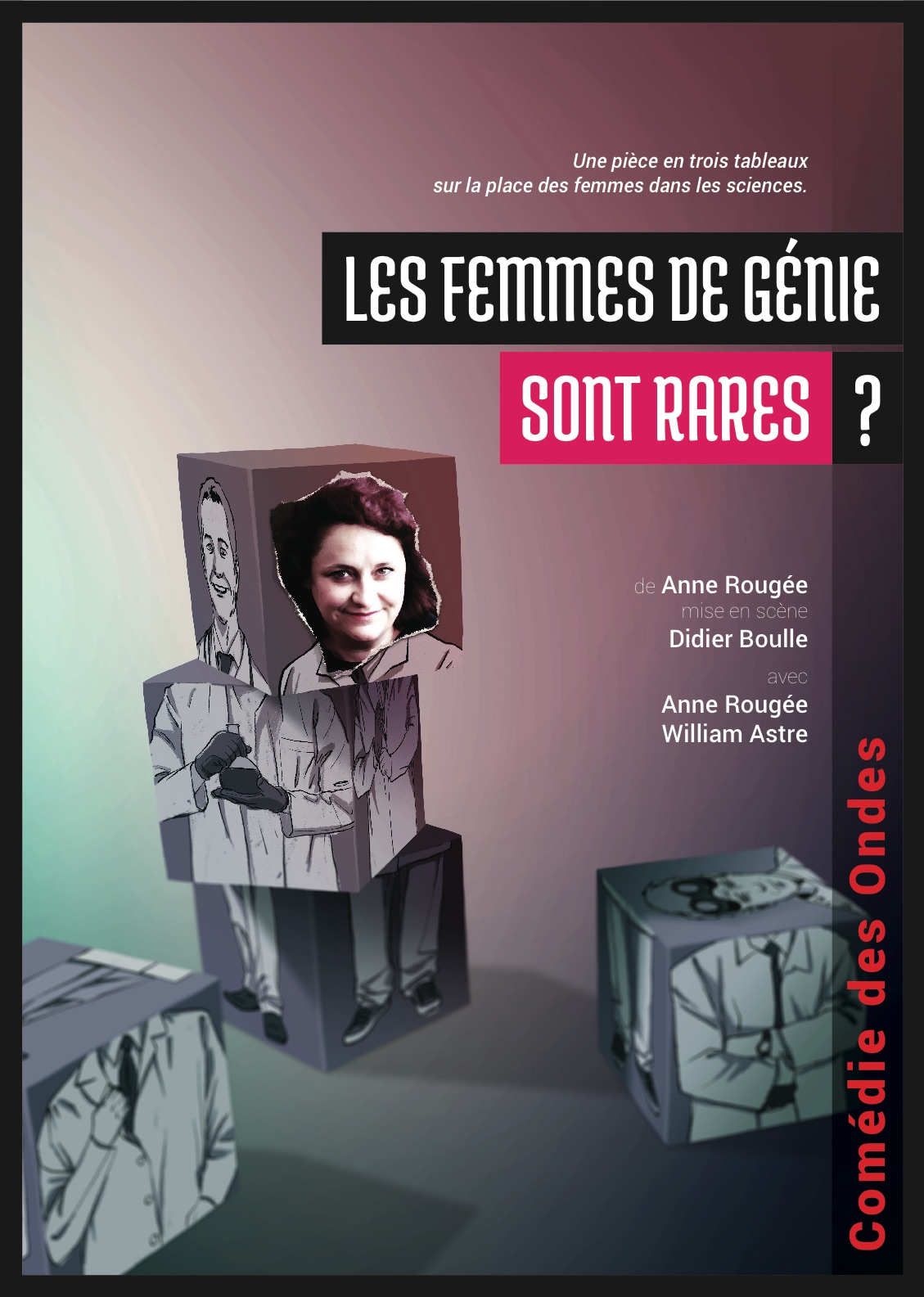 Marie Curie, Ada Lovelace et Émilie du Châtelet – Trois femmes qui ont marqué la science. Trois destinées, trois pionnières, présentées par une femme et un homme d’aujourd’hui. Elle et Lui font revivre le souvenir de ces femmes de science, évoquant leurs parcours, leurs partenaires et leurs vies. De leur relation surgira l’actualité de ces thèmes. Et de leur complicité naîtra une vision partagée de la science.